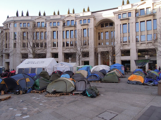 Gdy dotarliśmy do Katedry przeżyliśmy prawdziwe uniesienie podziwiając budowlę i szok co się pod jej bramami dzieje. W Warszawie mieliśmy swój długotrwały protest pod pałacem prezydenta i zbieranie się wokół smoleńskiego krzyża. W Londynie okazało się, że również mają skupiska dziwnych ludzi mających dziwne cele i robiących z miasta swoisty jarmark. Pod katedrą rozstawiło się miasteczko paraekologów protestujących przeciwko wszystkiemu, tak na prawdę nie wiadomo co chcieliby swoją akcją osiągnąć i co mają w planach. Londyńczycy chcieli ich przepędzić tak samo jak Warszawiacy zbiorowisko pod krzyżem, ale widać tam są protestujący również wytrwali, bo trwają przy swoim.